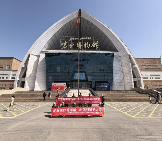 党建领航,“语”铸民族同心魂。“推普+铸牢中华民族共同体意识”实践活动如期开展,实践团将推广国家通用语言文字与铸牢中华民族共同体意识紧密结合,首站来到喀什博物馆。在这里,团队成员化身普通话“宣传员”与文化“讲解员”,用标准、流利的普通话为参观者讲述中华民族的悠久历史、灿烂文化以及各民族团结奋斗的动人故事。从古老的文物到珍贵的历史照片,每一件展品都成为传播民族团结理念的生动教材。通过互动交流,引导参观者用普通话分享自己的感受,让普通话成为连接各民族心灵的纽带,在潜移默化中增强大家对中华民族的认同感和归属感,使中华民族共同体意识深深扎根于每个人心中。