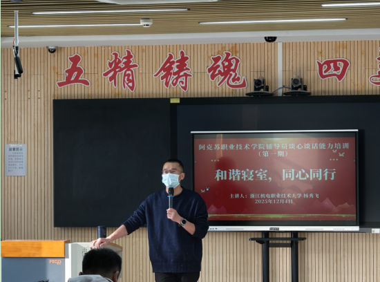为充分发挥浙江援疆资源优势,切实提升学院辅导员谈心谈话能力,助力和谐校园建设,2025年12月4日下午,辅导员谈心谈话能力培训第一期在厚德楼三楼智慧教室正式开班。本次培训由金华职业技术大学援疆教师现任阿克苏职业技术学院学生工作部(学生处)副处长吴昊主持,来自各二级学院的30余名专职辅导员齐聚一堂,参与本次以“和谐寝室,同心同行”为主题的培训活动。